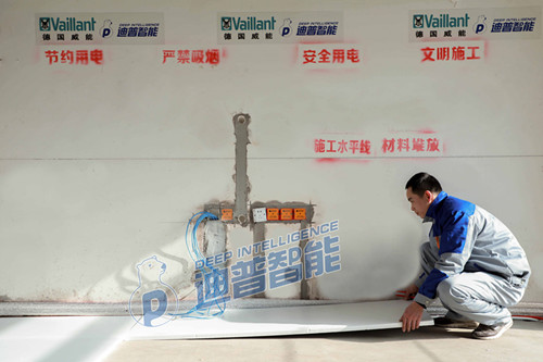 第六步:接分水器。我們用的分水器是威能進口的VaiM地板采暖分集水器VaiM系列集分水器針對地板輻射采暖系統設計,主管黃銅熱壓一體鍛造成型,最大程度保證了強度的同時,也最大程度的降低了漏水的可能性。內部結構設計合理,優化各支路的流量平衡,從而可以更好的控制地板輻射采暖系統的熱量,降低系統水流阻力。