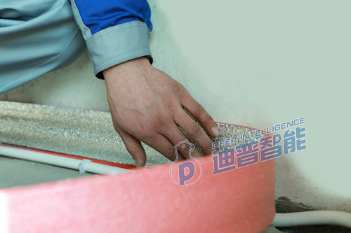 第一步:鋪設邊界保溫條。我們公司定制的邊界保溫條以EPE珍珠棉主要材料,顏色為粉紅色。鋪設邊界保溫條主要是為了減少地暖熱量的流失。它不僅可以減慢由地面受熱而導致的水泥蓄熱層膨脹,防止墻面水泥層卷起;而且能夠阻擋水泥沿著邊縫往下流淌,以免出現材料浪費或后期出現地面咯吱聲。所以,鋪設邊角保溫條是非常有用的。
